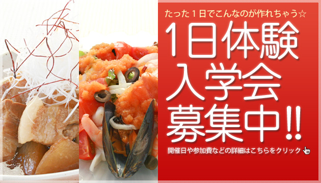 全くの初心者で、どの料理教室に行こうか悩んでいる。料理は好きで、レパートリーをもっと増やしたい!同じ趣味を持ったお友達を増やしてみたい!といった皆様だからこそ、試していただきたい一日体験入学会です。お申し込みは、こちらのフォームより随時受付ております。