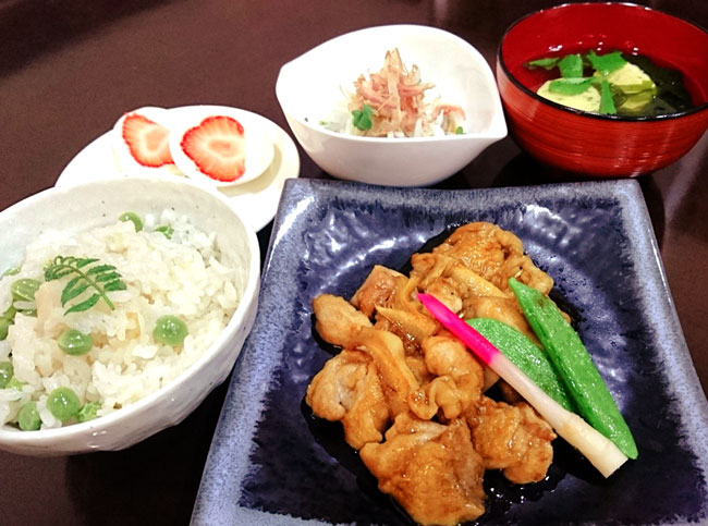 ★新若布とちりめんじゃこの酢の物 ★小海老と新玉ねぎのかき揚げ ★じゃがいもと鶏肉の含め煮 ★白玉きな粉団子 |