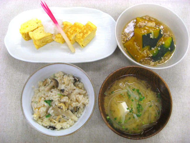 | 7回目 | だしの取り方と使い分け | ★いりこだしの味噌汁 ★あさりと小松菜の煮物 ★出し巻き玉子 ★かやくご飯 |